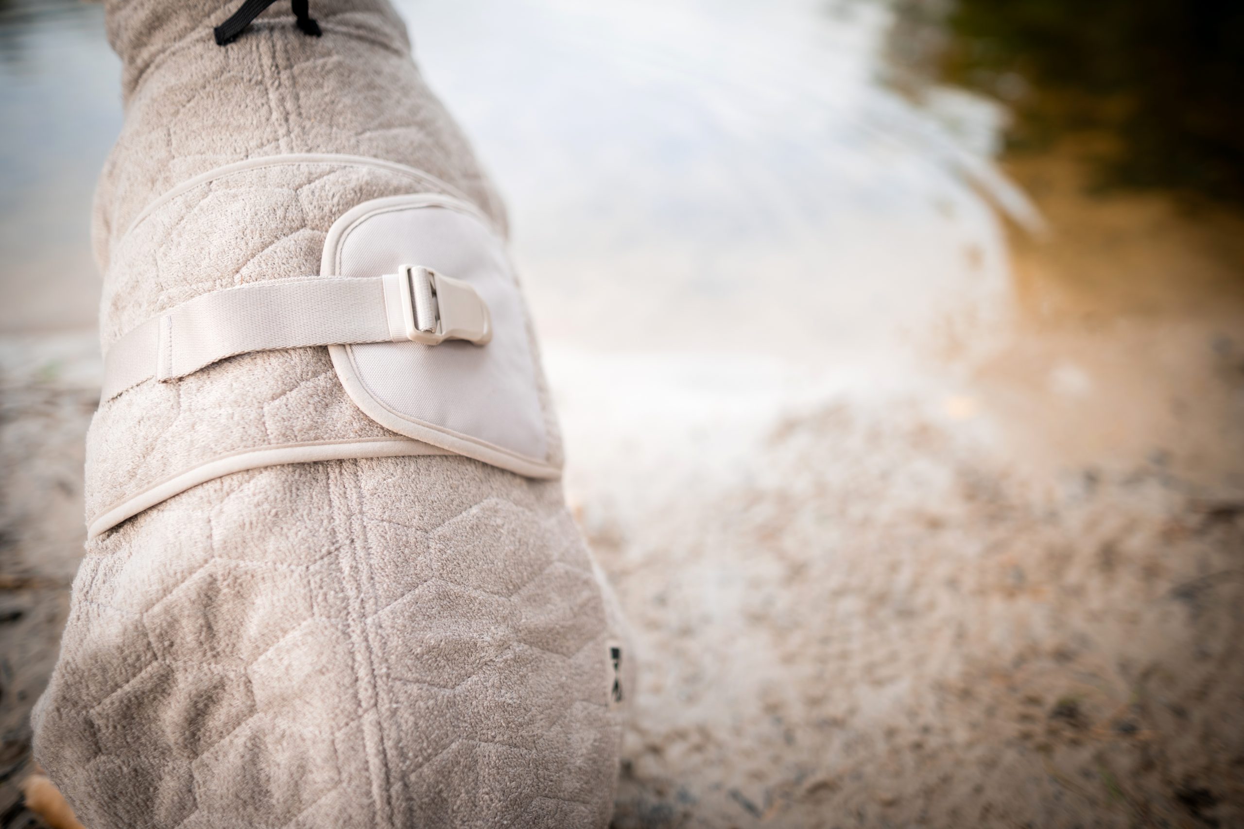 Er hat eine Kordelzugeinstellung, eine Aufhängeschlaufe und anpassbare Beinschlaufen. Falls Dein Hund den Bademantel für Hunde mal draußen tragen sollte / muss, sind sogar reflektierende Details verarbeitet. Derzeit gibt es diesen Bademantel für Hunde nur in der Farbe „Sand“.