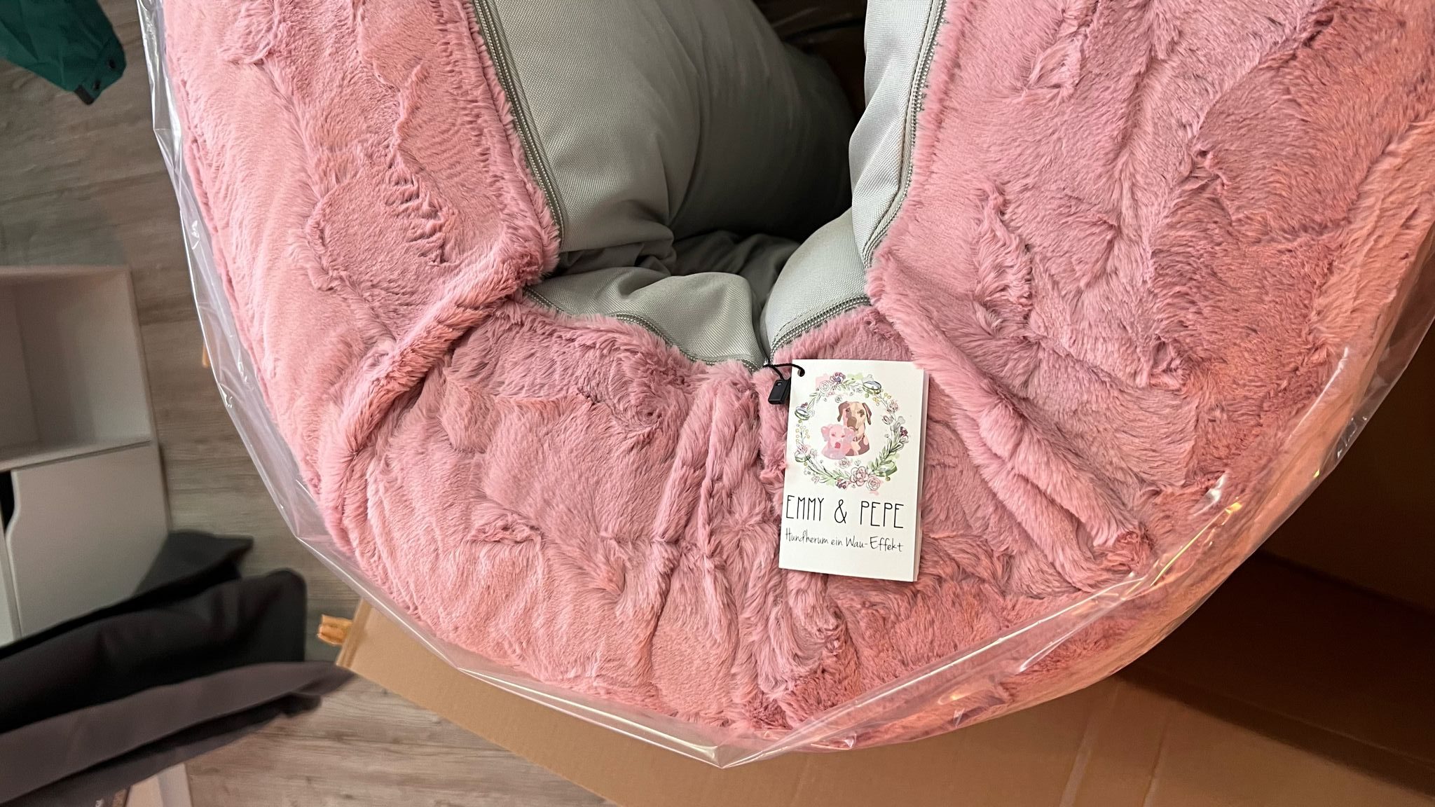 Ganz ehrlich? Ich habe mich influencen lassen. Ich hatte das Emmy & Pepe Wau-Bed schon bei einigen gesehen und es hat mir einfach so gut gefallen. Natürlich konnte ich auf den Fotos nur die Optik bewerten. Aber ich habe auch den ein oder anderen befreundeten Petfluencer um seine Meinung gefragt. Nun ist dieses Hundebett sicherlich nicht günstig, aber ich entschied mich trotzdem, es zu probieren und nach einigem Überlegen bestellte ich das Hundebett in einer ovalen Form. Auch einen Wechselbezug bestellte ich wenige Tage später.