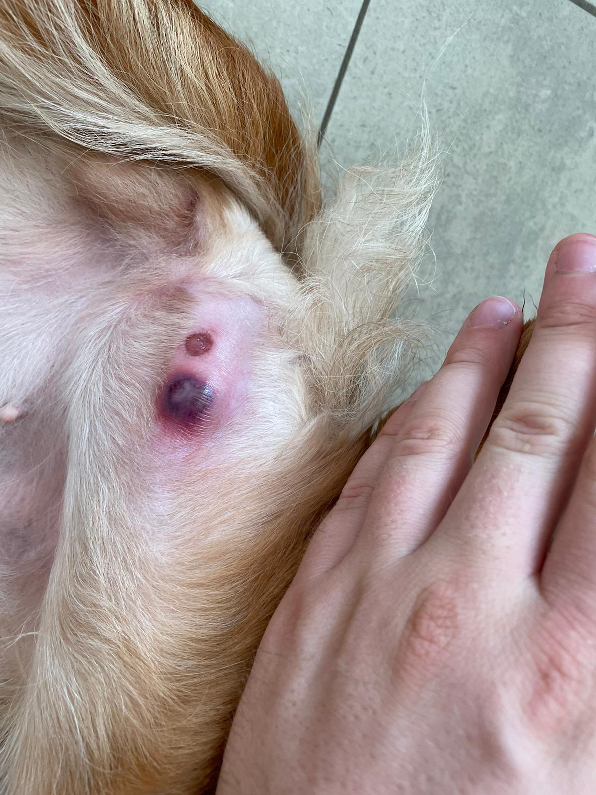 Die Gebärmutter und Schwellung wurde per Ultraschall untersucht aber es konnte nichts festgestellt werden. Trotzdem wurde uns zur Kastration geraten. Völlig unverständlich, denn Binti hatte bis zu diesem Zeitpunkt nie Probleme mit der Läufigkeit. Ohne Befund wurde sie wieder „entlassen“. Die Schwellung wanderte in den nächsten Tagen den Oberschenkel hoch und wurde blau/rot.