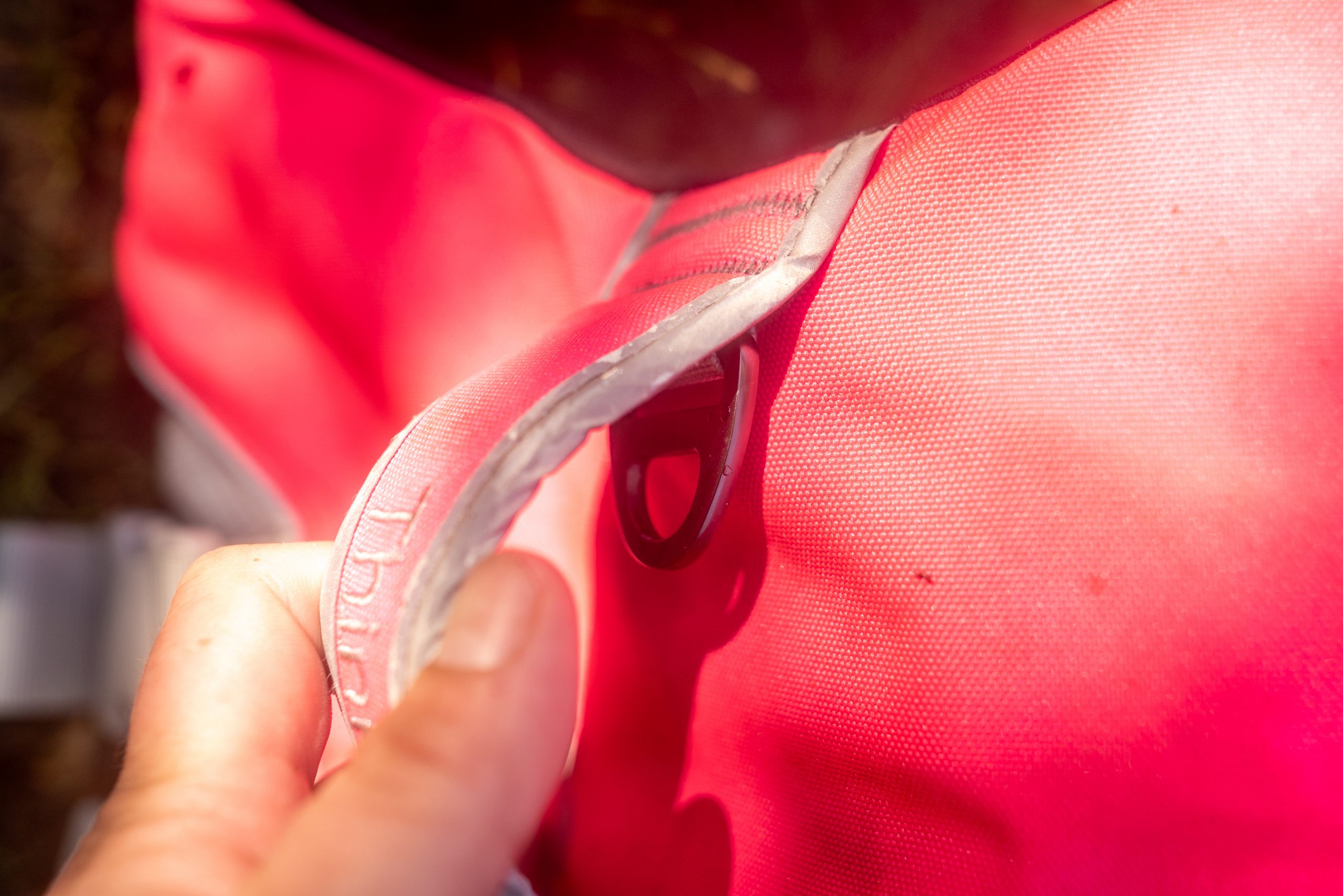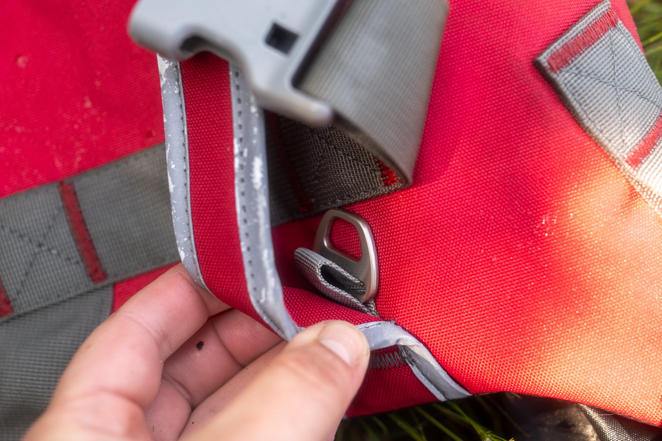 Auf dem Rücken findest Du neben einem strapazierfähigen Griff (wir haben ihn natürlich getestet) auch einen O-Ring, sofern Dein Hund mal angeleint werden muss. Ich mache das übrigens auf dem SUP nie, weil mir die Verletzungsgefahr zu groß ist. Zusätzlich sind die Schwimmwesten für Hunde von Hurtta mit Reflektoren ausgestattet und die verschiedenen Farben sind sehr gut sichtbar.