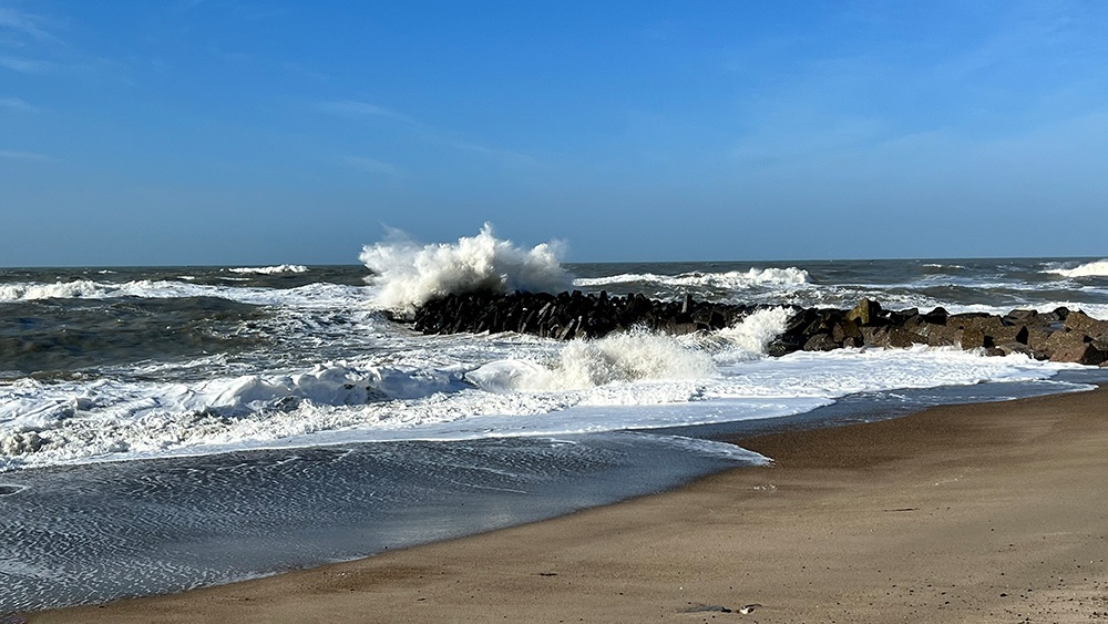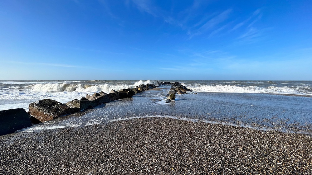 Du kannst den Leuchtturm sogar besichtigen. Dieses haben wir aber gelassen und sind eine Treppe herunter an den Strand gegangen. Du findest viele Wellenbrecher entlang des Strandes. Es war schon beeindruckend, wie das Wasser an ihnen hoch spritzt und wie die Wellen wie eine Walze an ihnen lang drücken. An dieser Stelle ein kleiner Tipp: Sollte so starker Seegang sein wie bei uns, dann leine Deinen Hund bitte zur Sicherheit an. Ein Hund kann diesen Wellen nichts entgegensetzen!